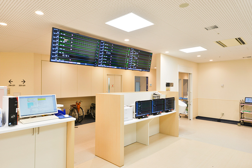 循環器内科では、急性心筋梗塞・狭心症、腎臓内科では、シャント造設・透析導入・腎生検、救急科では、感染症・交通外傷等の疾患の治療・看護を行っています。
